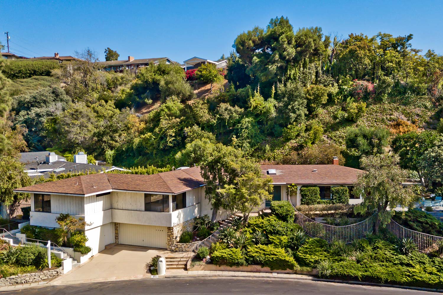 First time on market in almost 60 years- great location, great size, and fantastic opportunity! Wonderful family home in the sought-after “Palisair” neighborhood in Pacific Palisades, just west of Temescal Canyon. The home is set above street level on a large hillside lot, which creates a feeling of privacy and tranquility while offering views of the canyon, ocean, and lush hillside. Built in 1960, the house has mid-century modern bones including walls of glass and doors that open out the wrap-around yard; a massive stone fireplace, and an open floorplan with nice indoor/outdoor flow. All of the living areas are on one level with a two-car garage below that has direct access to the house. The eat-in kitchen opens onto an ample patio for al fresco dining with partial ocean views. The spacious master suite has radiant floor heating in the en-suite bathroom, a jetted tub, and a large walk-in closet. lower level. The house is ready and waiting for the next owners to come in and really make it their own. Easy access to hiking trails, the Village, and the beach.